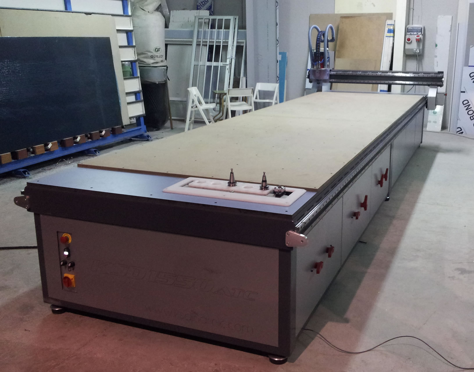 Fresadora diseñada espresamente para el Fresado y Corte del material Panel Composite. Dispone de amarre del material mediante vacio en toda la superficie y con 6 zonas a controlar por el operario.
